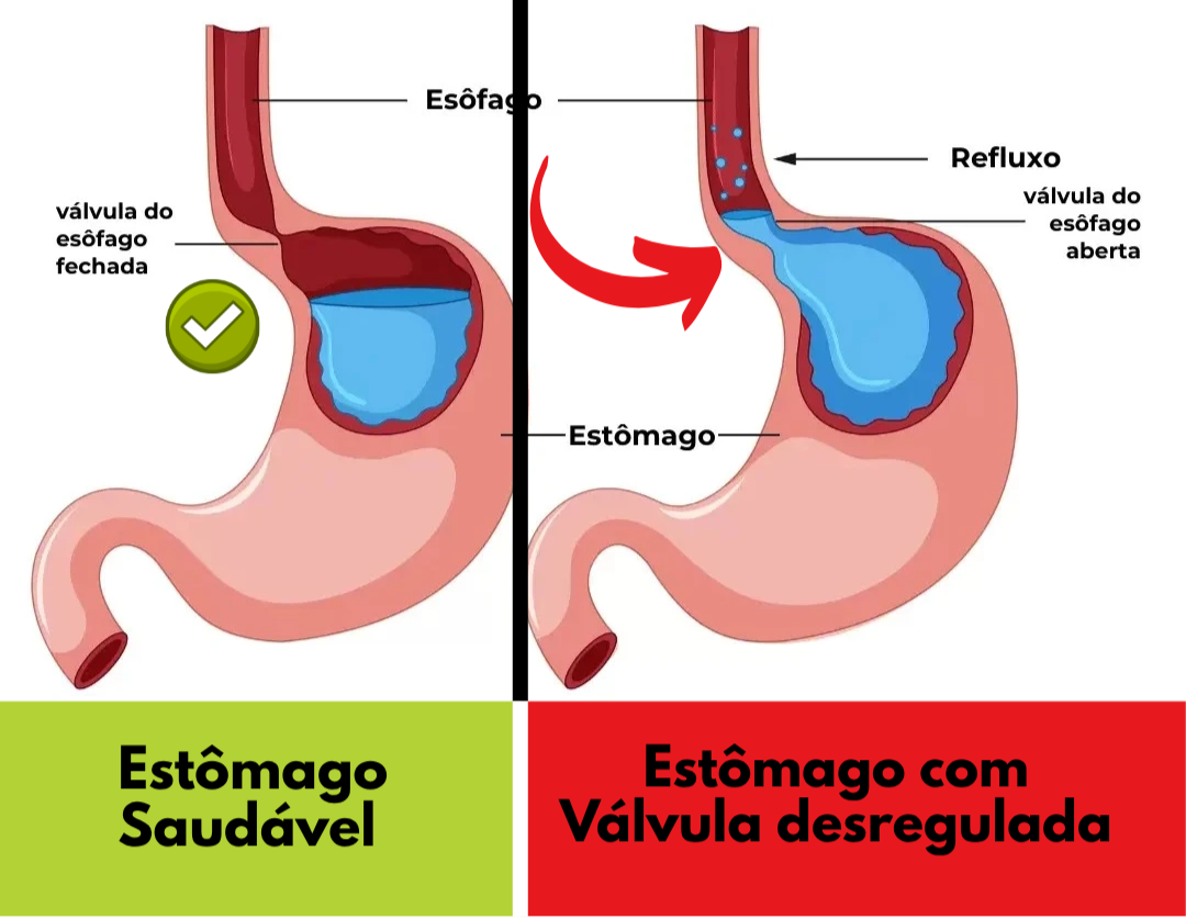Quando essa portinha perde força, ela não fecha mais completamente. E aí, mesmo pequenas quantidades de ácido sobem — causando tudo que você descreveu.